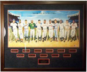 Description: This poster was given out to attendees of the 1989 500 Home Run Hitters Show in Atlantic City. It marked the first ever gathering of all then living 500 Home Run Hitters at one time. It is carefully signed up the leg by each player depicted and beautifully custom framed with engraved nameplates, hand carved stars and lines in the top matte of the double mattes, and wood frame. Visually stunning and done in private signings to provide quality autographs. Signed: Blue Sharpie Approximate Size: 43.5 X 32 Price: $3295. Back to the Memorabilia Page... |