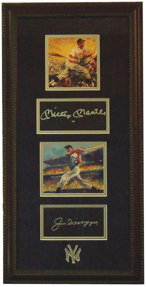 Description: LeRoy Neiman post cards of his famous prints of Mantle and DiMaggio, with nice bold cavas cuts featuring autographs in wide silver by each, all mounted on a beautiful custom framed suede and wood piece. Signed: Wide silver on a navy painted canvas. Approximate Size: 14 by 24 Price: SOLD! Back to the Memorabilia Page... |
