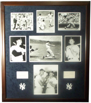 Description: This tribute to Mantle and Maris and their 1961 chase of of the Babe Ruth single season record. The top 3 photos are 8 x 10(s) with the left photo showing Roger scoring on his 61st home run in '61, the middle photo showing him scoring on a home run, and the right being Mickey's 49th H.R. in '61. The middle photo on the second row is an A P Wire photo of Roger hitting home run No. 61 in 1961. The photos on either side are Mickey and Roger in 1961, and the lower photo is an 11 x 14 of Mickey and Roger in 1961. Beside the lower photo are autographed cuts of Roger and Mickey. This is a large piece, over 38 x 38 double matted in suede with the N Y logos hand carved into the mattes, and framed in a nice wood. Signed: Ball Point pen Approximate Size: see description Price: $2195 Back to the Memorabilia Page... |