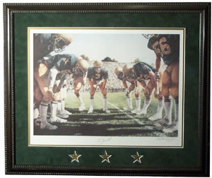 Description: Litho of Montana in huddle as quarterback of Notre Dame. It is signed by the artist, numbered, framed in suede and wood, and signed by Montana Signed: pencil in the bottom margin Approximate Size: Image is about 18 by 22 Price: $395 Back to the Memorabilia Page... |