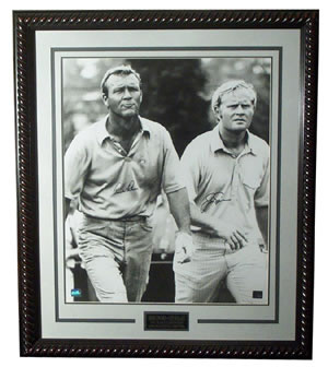 Description: 20 x 24 black and white photo of Arnold Palmer and Jack Nicklaus at the 1972 Team Championships. This piece comes from Gotta Have It Golf, with the holograms of the golfers authenticating their autographs. It is beautifully custom framed. Signed: Black sharpie Approximate Size: Image is 20 x 24 Price: $1795 Back to the Memorabilia Page... |