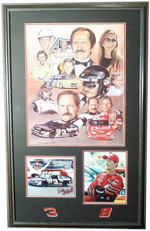 Description: The 18 x 24 George Wright litho of Earnhardt, Sr and jr., tops autographed photos of father and son. Signed: sharpie Approximate Size: Around 40 inches high by about 32 wide Price: $950 Back to the Memorabilia Page... |