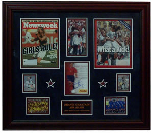 Description: The top photos are all from the articles on the Gold Cup victory. The middle card is autographed by Brandi Chastain. The bottom right small team photo of Mia Hamm's pro team is signed by Mia. it is all nicely framed with suede and engraved nameplate with wide cherry style wood. Signed: sharpie Approximate Size: Around 30 x 34. Price: $425 Back to the Memorabilia Page... |