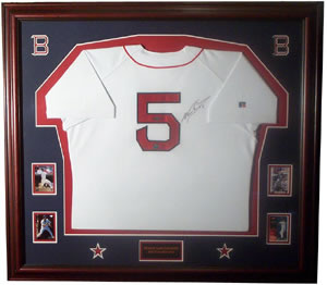 Description: Autographed Boston home uniform, signed on back with his famous NO. 5 showing, custom framed with cards, engraved nameplate and logos and stars carved in the mattes, with wide cherry wood frame. Signed: sharpie Approximate Size: 38 by 42 or so. Price: $795. Back to the Memorabilia Page... |