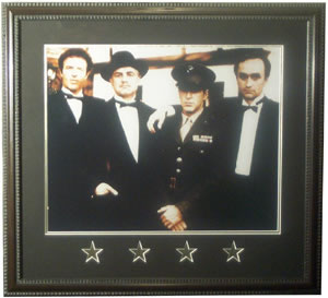 Description: 16 x 20 photo of the four Corleone men, double matted with stars carved into top matte and wood frame. Signed: N/A Approximate Size: 16 x 20 image size Price: $165 Back to the Memorabilia Page... |