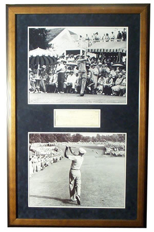Description: 2 famous 16 x 20 black and white prints of Ben Hogan, including bottom famous No. 1 iron to win US Open. All framed together with signed personal check of Ben. Custom framed in suede and wood. Signed: ball point Approximate Size: 26 wide by 42 high Price: $995 Back to the Memorabilia Page... |