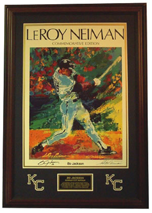 Description: Lithograph autographed by artist LeRoy Neiman and subject, Bo Jackson. The entire piece is beautifully custom framed with hand carved K C logos, engraved plate and double mattes in a nice wood frame. Signed: Black by both Approximate Size: 36 by 28 Price: $895 Back to the Memorabilia Page...