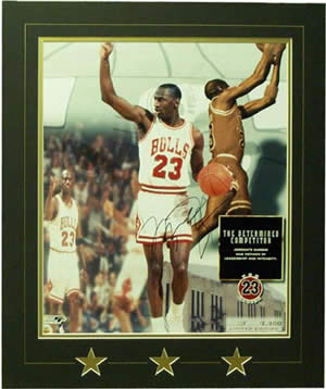 Description: 16 x 20 color photo of Michael as a Bull, autographed at a golf tournament. This photo was actually signed at the Lemieux golf tournament, and it comes with a photo of Michael signing. Signed: black sharpie Approximate Size: 16 x 20 photo Price: $1195 Back to the Memorabilia Page... |