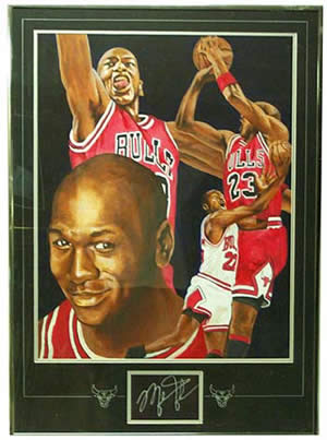 Description: This original painting by Scott Lucas is a multi-imaged Michael Jordan piece. The painting is for sale, which has been framed with a silver signed canvas cut of Michael Jordan. However, we cannot yet verify the autograph on the cut, so the painting is offered for sale, without the cut until we can absolutely verify its authenticity. Signed: N/A Approximate Size: 24 X 30 Price: $895 Back to the Memorabilia Page... |