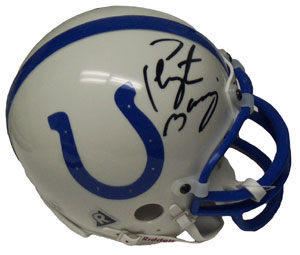 Description: Peyton was the #1 overall draft pick in 1998, by the Indianapolis Colts, out of Tennessee. Through his first three years of play, Manning has shown nothing to indicate that he wasn't deserving of that distinction. His rookie season, Peyton turned in a 71.2 passer rating, the best in NFL history for a rookie. He also set rookie marks for completions (326), attempts (575), yards (3,739), and touchdowns (26). In just his second season in the NFL (1999), Peyton led the Colts to the playoffs. Over the 2000 season, Manning became just the 5th passer in history to throw for more than 4000 yards in consecutive seasons. All this comes after a career at the University of Tennessee, where Peyton holds 42 NCAA, SEC and Tennessee records. Now, entering the 2001 season as a 3-year veteran, and only 25 years old, with Marvin Harrison, Edgerinn James, and a constantly-improving defense, Peyton is ready to REALLY start shining...and winning Super Bowls. This mini-helmet comes from Just Minors, with hologram on the helmet itself, and a Just the Proof C.O.A. that shows Peyton signing one of the items in Nashville, in 1999. Signed: Black Sharpie Approximate Size: Mini-Helmet (1/3 Standard) Price: $95.00 Back to the Memorabilia Page... |