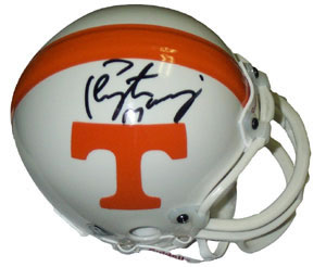 Description: Peyton was the #1 overall draft pick in 1998, by the Indianapolis Colts, out of Tennessee. Through his first three years of play, Manning has shown nothing to indicate that he wasn't deserving of that distinction. His rookie season, Peyton turned in a 71.2 passer rating, the best in NFL history for a rookie. He also set rookie marks for completions (326), attempts (575), yards (3,739), and touchdowns (26). In just his second season in the NFL (1999), Peyton led the Colts to the playoffs. Over the 2000 season, Manning became just the 5th passer in history to throw for more than 4000 yards in consecutive seasons. All this comes after a career at the University of Tennessee, where Peyton holds 42 NCAA, SEC and Tennessee records. Now, entering the 2001 season as a 3-year veteran, and only 25 years old, with Marvin Harrison, Edgerinn James, and a constantly-improving defense, Peyton is ready to REALLY start shining...and winning Super Bowls. This mini-helmet comes from Just Minors, with hologram on the helmet itself, and a Just the Proof C.O.A. that shows Peyton signing one of the items in Nashville, in 1999. Signed: Black or Orange Sharpie (our choice) Approximate Size: Mini-Helmet (1/3 Standard) Price: $95.00 Back to the Memorabilia Page... |