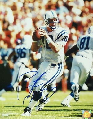Description: Peyton was the #1 overall draft pick in 1998, by the Indianapolis Colts, out of Tennessee. Through his first three years of play, Manning has shown nothing to indicate that he wasn't deserving of that distinction. His rookie season, Peyton turned in a 71.2 passer rating, the best in NFL history for a rookie. He also set rookie marks for completions (326), attempts (575), yards (3,739), and touchdowns (26). In just his second season in the NFL (1999), Peyton led the Colts to the playoffs. Over the 2000 season, Manning became just the 5th passer in history to throw for more than 4000 yards in consecutive seasons. All this comes after a career at the University of Tennessee, where Peyton holds 42 NCAA, SEC and Tennessee records. Now, entering the 2001 season as a 3-year veteran, and only 25 years old, with Marvin Harrison, Edgerinn James, and a constantly-improving defense, Peyton is ready to REALLY start shining...and winning Super Bowls. This 11x14 comes from Just Minors, with hologram on the item itself, and a Just the Proof C.O.A. that shows Peyton signing one of them in Nashville, in 1999.