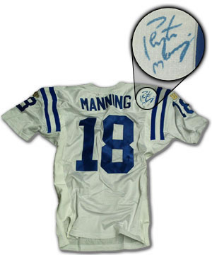 Description: Peyton was the #1 overall draft pick in 1998, by the Indianapolis Colts, out of Tennessee. Through his first three years of play, Manning has shown nothing to indicate that he wasn't deserving of that distinction. His rookie season, Peyton turned in a 71.2 passer rating, the best in NFL history for a rookie. He also set rookie marks for completions (326), attempts (575), yards (3,739), and touchdowns (26). In just his second season in the NFL (1999), Peyton led the Colts to the playoffs. Over the 2000 season, Manning became just the 5th passer in history to throw for more than 4000 yards in consecutive seasons. All this comes after a career at the University of Tennessee, where Peyton holds 42 NCAA, SEC and Tennessee records. Now, entering the 2001 season as a 3-year veteran, and only 25 years old, with Marvin Harrison, Edgerinn James, and a constantly-improving defense, Peyton is ready to REALLY start shining...and winning Super Bowls. This authentic Indianapolis Colts Jersey comes from Just Minors, with a hologram on the item itself, and a Just the Proof C.O.A. that shows Peyton signing one of them in Nashville, in 1999. Signed: Blue Sharpie Approximate Size: Size Large Price: $250.00 Back to the Memorabilia Page... |