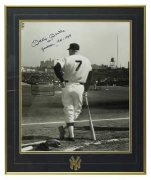 Description: This 16 x 20 B & W is an AP (Associated Press) Wire photo from the original negative. It depicts Mickey Mantle at the '64 World Series, waiting at Yankee Stadium for batting practice. We have this piece unsigned for sale for $145 for the photograph alone, and mounted with a signed 4 x 6 post card for about $495. We also have it with a signed 8 x 10 photo for $695. Signed: Blue Sharpie Approximate Size: 16 X 20 Price: Not for Sale Back to the Memorabilia Page... |