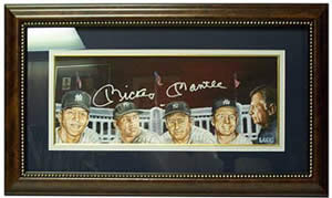 Description: This is a most unusual piece. The navy painted canvas was originally used to collect a large Mickey Mantle autograph in wide silver. Then sports artist, Scott Lucas hand painted Mantle on it, featuring Mickey through the years, rookie to retirement and then older. Beautifully framed, it was a personal piece, now offered for sale. Signed: Silver Paint Pen Approximate Size: 21 X 10 Price: $4995 Back to the Memorabilia Page... |