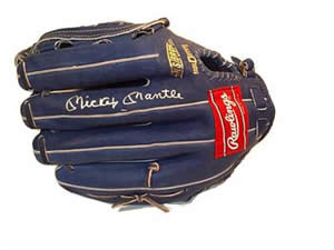 Description: This is a blue Rawlings glove, beautifully signed by Mickey Mantle in silver. Signed: Silver Paint Pen Approximate Size: Standard Price: Not for Sale. This belongs to Mike Back to the Memorabilia Page... |