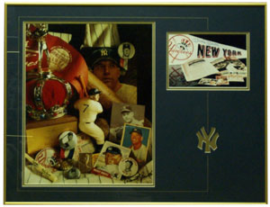 Description: The 16 x 20 photo is the one used by David Spindel, known New York photography artist, to make a poster, now discontinued. This photo features Barry Halper memorabilia, and it is signed by David. The 8 x 10 photo also features more Mantle/Yankee memorabilia. This item is custom framed with the NY logo hand carved into the top matte. The ensemble is autographed by Mickey on the small photo, on the Yankee penant. Signed: Blue Sharpie Approximate Size: 24 x 31 Price: $495. Back to the Memorabilia Page... |