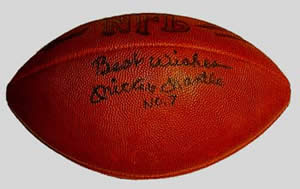 Description: This is an Official NFL football, autographed "Best Wishes" "Mickey Mantle No. 7". We do not know of many of these having ever been done. Signed: Black Sharpie Approximate Size: Standard Price: $2500. Back to the Memorabilia Page... |