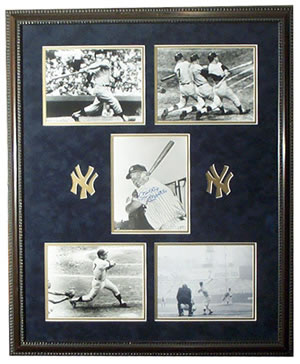 Description: The middle 8 x 10 has been signed and verified by PSA/DNA. The other famous photos (top left, Mick's 49th HR in '61; top right, Mick's 501st HR, triple exposure. Both are A P wire photos from the original negatives. The bottom left is a Hall of Fame archive photo and bottom right is a rookie shot. It is framed in suede mattes with hand carved logos and wood frame. Signed: blue sharpie Approximate Size: around 36 tall by 25 wide Price: $995 Back to the Memorabilia Page... |