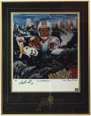 Description: This actual piece is sold, but we have others, one of which is framed in Dolphin Tourquoise suede and orange, and double matted in a wood frame. The piece is a photo of a painting by Robert Stephen Simon, sports artist of the year in 1992. It is signed by Simon and then signed by Marino, with his hologram affixed to guaranty authenticity. Signed: sharpie, sometimes black, sometimes blue Approximate Size: The print is about 16 x 20. Price: $495 Back to the Memorabilia Page... |
