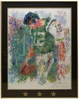 Description: The Leroy Neiman print features Joe Namath as a N.Y. Jet, where he became known as "Broadway Joe." This piece is signed by JOE NAMATH and artist, LEROY NEIMAN. It is double matted with hand carved stars in the top matte. Neiman no longer signs these, and we understand Joe will not sign them if Neiman has. so you cannot get this done now, (and the unsigned print is very rare to find) This one depicted sold, and we have one left, framed in greed suede and nice wood frame. It is our last one for sale. Signed: the last one we have is signed in gold paint pen by Joe and thin sharpie by Neiman Approximate Size: Print is about 24 by 30 Price: $1795. (and due to go up) Back to the Memorabilia Page... |