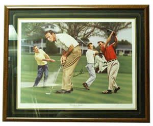 Description: Arnold Palmer autographed litho, honoring his Masters victories. Signed: BlackSharpie Approximate Size: 24 by 30 Price: This one pictured is Not for Sale! (But we how have acquired one that is nicely framed and autographed by artist and Palmer, being offered at a price of $950 Back to the Memorabilia Page... |