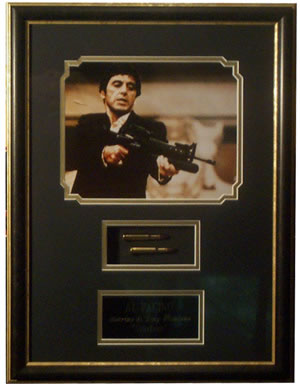 Description: Pacino as Tony Montana (Scarface) framed with machine gun bullets in shadowbox Signed: N/A Approximate Size: 16 x 20 or so Price: $129 Back to the Memorabilia Page... |