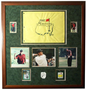 Description: Tribute of 2002 Masters Victory by Tiger Woods. This features several cards and photos of Tiger, an autograph that came from a multi signed hat brim, the 2002 Masters Badge, a 2002 Masters Bag Tag, all custom framed in green Masters suede, double matted, and in a nice wood frame. Signed: black sharpie on the hat brim material Approximate Size: 36 by 36 or larger. Call for exact measurements, if this is important. Price: $1695. Back to the Memorabilia Page... |