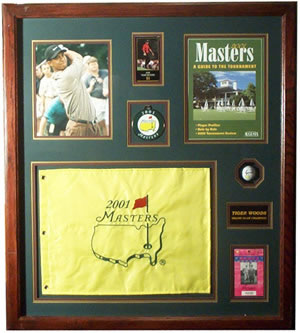 Description: This is a shadow box, celebrating the Masters mastery of Tiger Woods. It features a golf ball which was obained from Tiger circa 1997 (he does not apparently sign them any longer. This ball comes with a sworn affidavit (notarized) from the person who obtained this autograph direct from Tiger. The piece also featuers Tiger's Rookie Card (from the Masters Set), a 1997 card from that set. Along with this is a program from the 2001 Masters, a 2001 Bag Tag, a badge from the 2001 Masters (this was where Tiger completed his Grand Slam) and the 2001 Masters pin flag. The piece features double mattes and a nice dark oak frame. It is visually stunning. Signed: sharpie...on the ball Approximate Size: 38 x 38 or so. call for exact measurements, if this is important. Price: $2195. Back to the Memorabilia Page... |